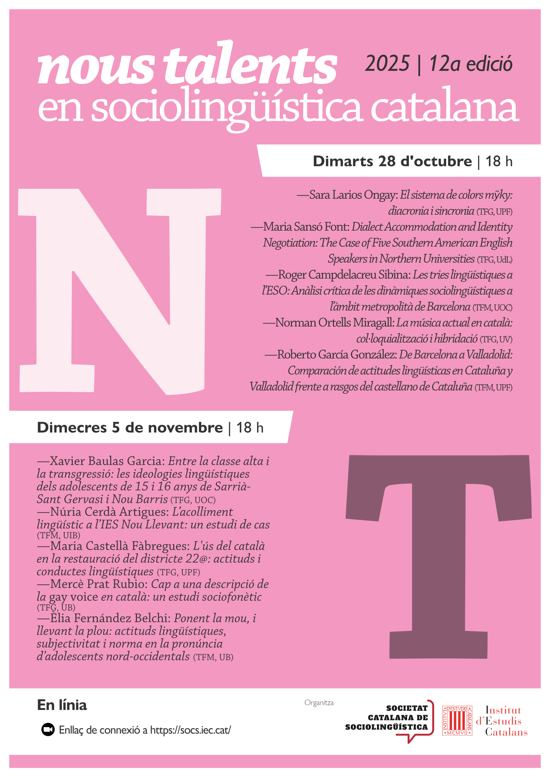 Els actes de la dotzena edició dels «Nous talents en sociolingüística catalana», una iniciativa de la Societat Catalana de Sociolingüística (SOCS) reconeix, com és habitual, els treballs de fi de grau i de fi de màster d’excel·lència en les diferents línies de recerca en sociolingüística. S’han organitzat dues jornades obertes al públic en què els i les estudiants guardonats presentaran un total de deu treballs defensats en diferents universitats dels territoris de llengua catalana el curs 2024/2025.